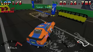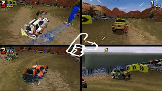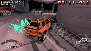 This is a hybrid of Rally and circuit racing. From rally it draws the jumps and “one racer at a time against the clock” time-trial format. However, the tracks are similar to circuit racing, with each race consisting of multiple laps around the same track (the track may change slightly from lap to lap, however) Controls are very tight, simple and arcadey, similar to Mario Kart (accelerate, reverse, steer, drift), but with a bit more dynamic “smash into things” physics.